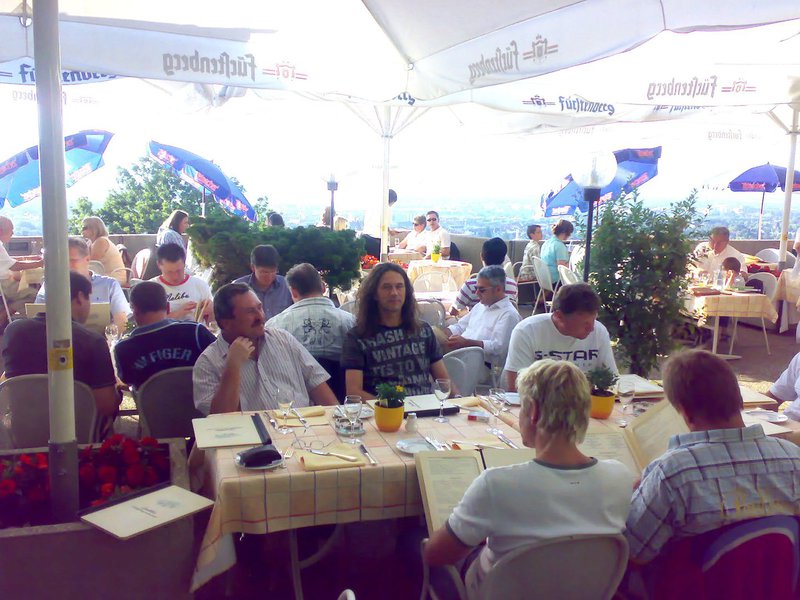 Der Abend wurde eingeläutet mit einer bescheidenen Brotzeit im bekannten Höhenrestaurant „Dattler“. Auf der wunderschönen Terrasse über den Dächern von Freiburg genoss man bei Shrimps, Elsässer