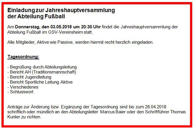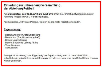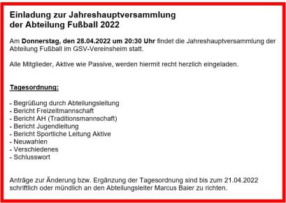 Am Donnerstag, den 09.05.2019 um 20:30 Uhr findet die Jahreshauptversammlung der Abteilung Fußball im GSV-Vereinsheim statt.
