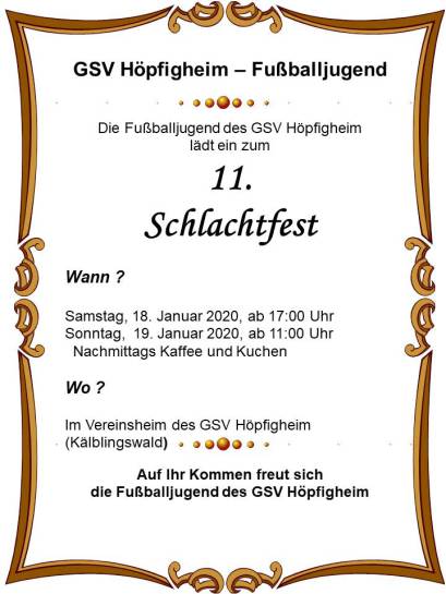 Wie im letzten Jahr veranstaltet die GSV-Jugend wieder das beliebte Schlachtfest. Somit werden zum 11. mal im Vereinsheim des GSV typische „Besengerichte“ serviert. Von der Schlachtplatte, über Salzfleisch, Bratwürsten, Maultaschen, usw. können sich die Freunde herzhafter, schwäbischer Gerichte es so richtig gut gehen lassen. Dazu gereicht wird der gute Wein aus Höpfigheim, sowie antialkoholische Getränke und diverse Biere. Am Sonntag Nachmittag gibt es dazu noch Kaffee und Kuchen. Genießen sie ein paar schöne Stunden im Kälblingswald, der nach einem üppigen Mahl auch zu einem kleinen Verdauungsspaziergang einlädt. Auf ihr Kommen freut sich die Fußballjugend des GSV Höpfigheim.