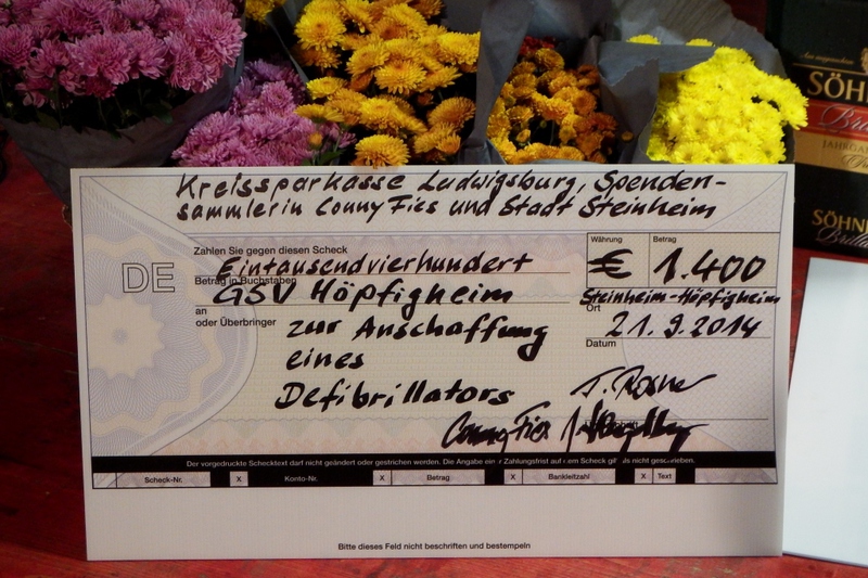 Am vergangenen Kelterfest nun wurde von Bürgermeister Rosner, Herrn Hengstberger (KSK) und Frau Fies (Stadtverwaltung Steinheim) an unseren GSV-Vorstand Herbert Schütz ein Scheck in Höhe von1.400,-   zur Anschaffung eines Defibrillators übergeben. Noch während des Kelterfestbetriebes rief Frau Fies die Besucher zu einer Spende auf – und unser Coach Herberth (!) und 3 Jungs aus der GSV-D-Jugend gingen mit Spenden-Eimern durch die Reihen. Bei der Zählung kamen so noch einmal sage und schreibe 456,-   zusammen, so dass jetzt das Gerät angeschafft und sogar der Wartungsvertrag bezahlt werden kann !!!