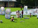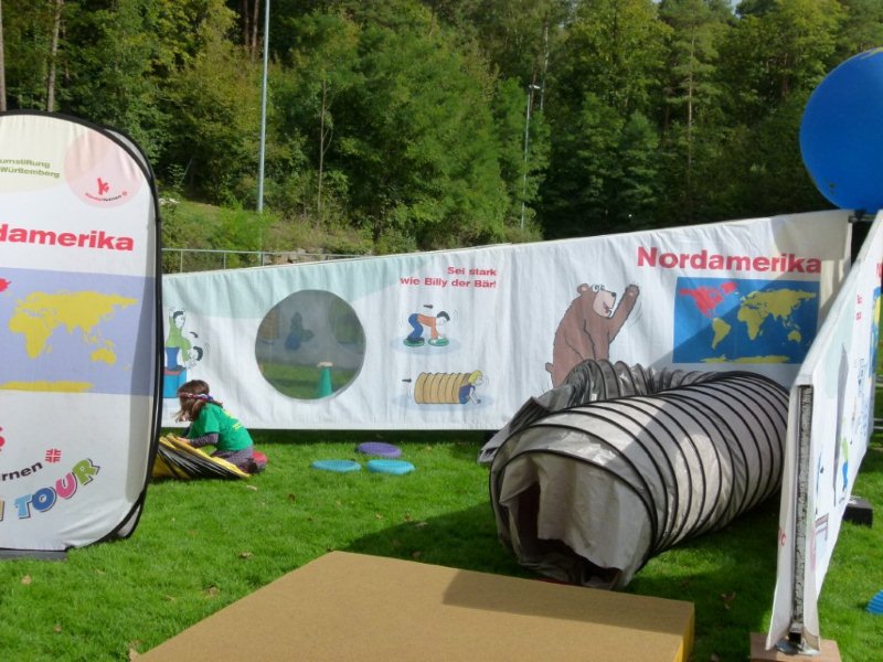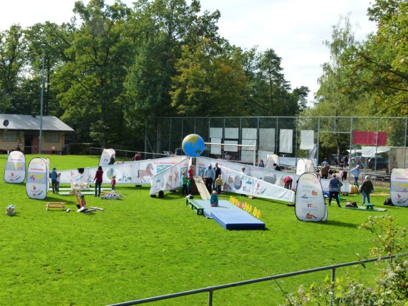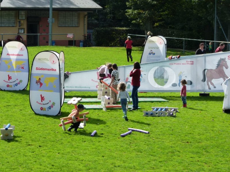Anlässlich zum Tag der offenen Tür hat der Waldkindergarten die mobile Kinderturnwelt des STB eingeladen. Es wurde auf dem Platz vor dem GSV Vereinsheim aufgebaut. Fleißige Helferinnen waren