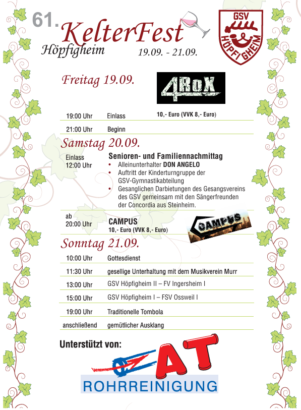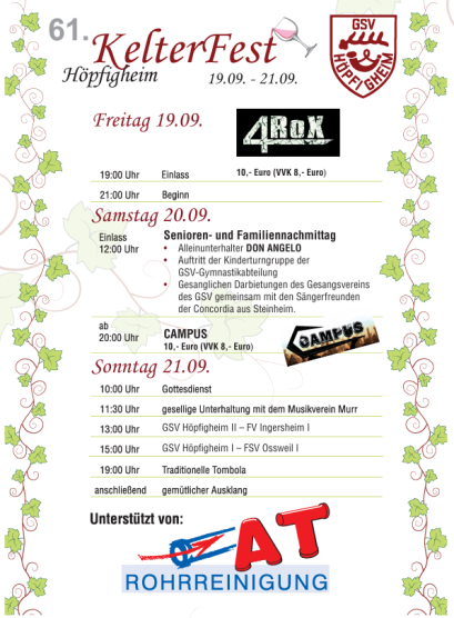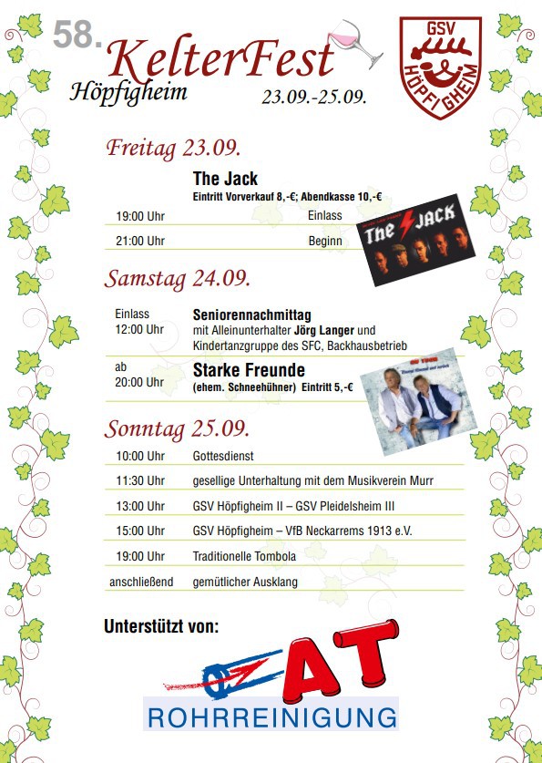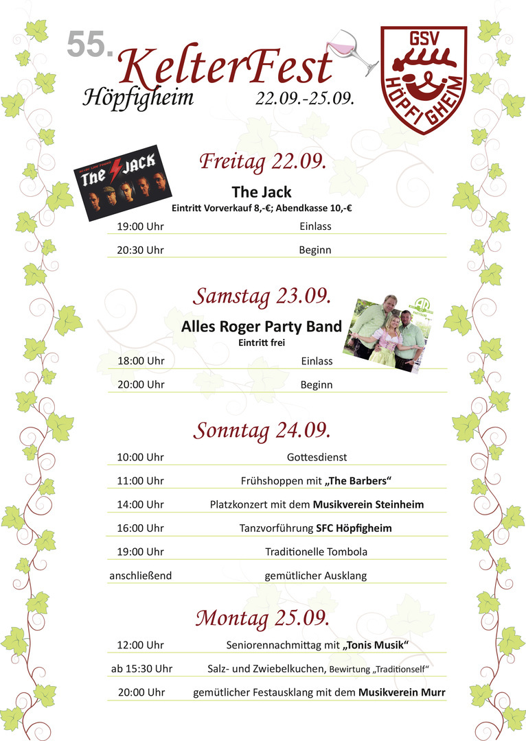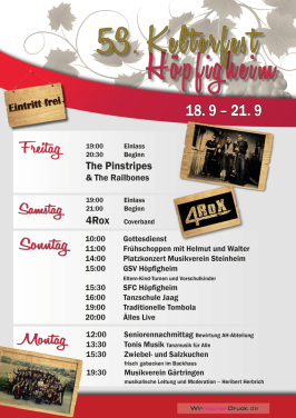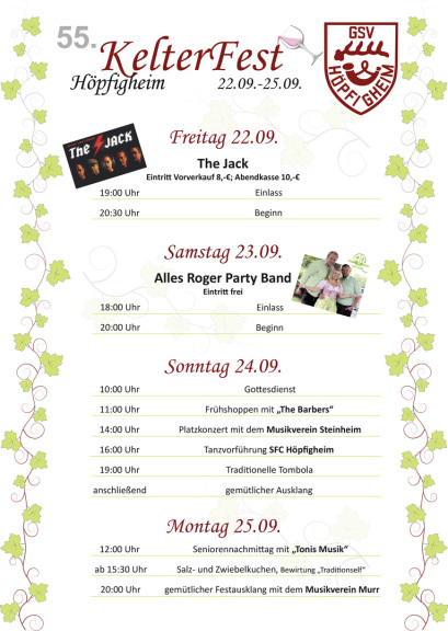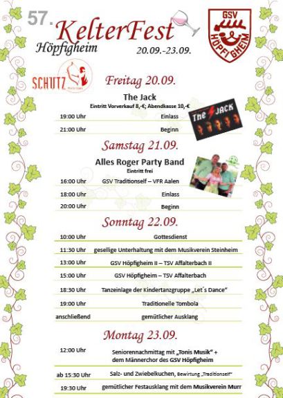 In diesem Jahr wird in Höpfigheim zum 55. Mal das traditionelle Kelterfest gefeiert. Entgegen der Tradition dies am 3. September Wochenende zu tun, findet das Fest dieses Jahr eine Woche später statt. Das Programm ist wieder bunt gemischt und für jede Altersgruppe ist mit Sicherheit etwas dabei: