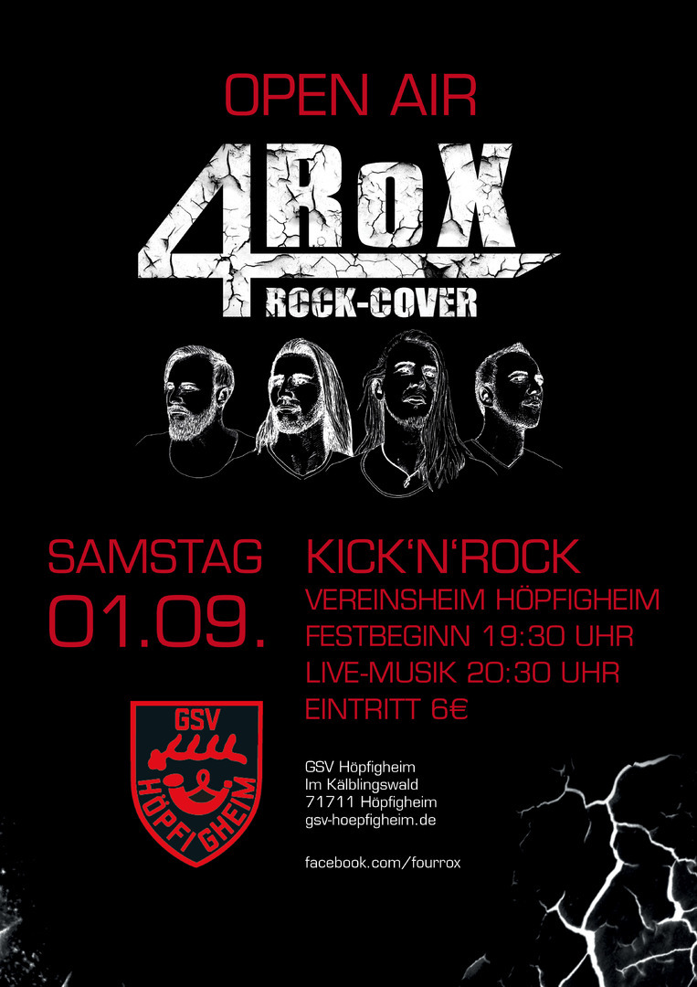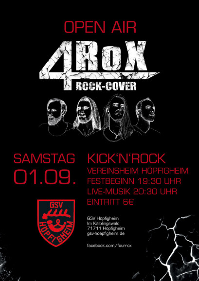 Beim GSV braut sich wieder etwas zusammen. Hoffentlich kein Gewitter wie vor 2 Jahren als das Open-Air beinahe in’s Wasser fiel. Petrus möge doch etwas gnädig sein und allen Freunden des GSV einen regenfreien Abend bescheren. Am 01.09.2018 tritt die Pleidelsheimer Cover-Band „4RoX“ auf dem Parkplatz beim GSV-Vereinsheim auf. Bereits im letzten November hatte die Band einen sensationellen Auftritt im Vereinsheim. Diesmal wird unter freiem Himmel gerockt. Die Band glänzt mit Coverversionen sämtlicher Rock-Klassiker. Von Black Sabbath über Bon Jovi, von Guns’n‘ Roses bis hin zu Green Day ist für jeden Rock-Fan etwas dabei. Das Open-Air beginnt um ca. 20:30 Uhr. Einlass am Sportgelände ist ab 19:00 Uhr. Der Eintritt an der Abendkasse beträgt 6,-€ (kein Vorverkauf). Für das leibliche Wohl ist bestens gesorgt. Der Durst kann mit nicht alkoholischen und alkoholischen Getränken gestillt werden. Und wem der Leberkäse zu fett war findet in unserer Bar etwas für seinen Magen.