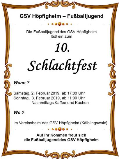 Der GSV Höpfigheim freut sich auf drei vergnügliche Tage und lädt alle Freunde des GSV herzlich ein. Lassen sie es sich mit einem knusprigen Kelter-Hähnchen und einem guten Viertele oder den anderen Leckereien aus unserer Küche schmecken. Wir freuen uns schon jetzt auf ihren Besuch.