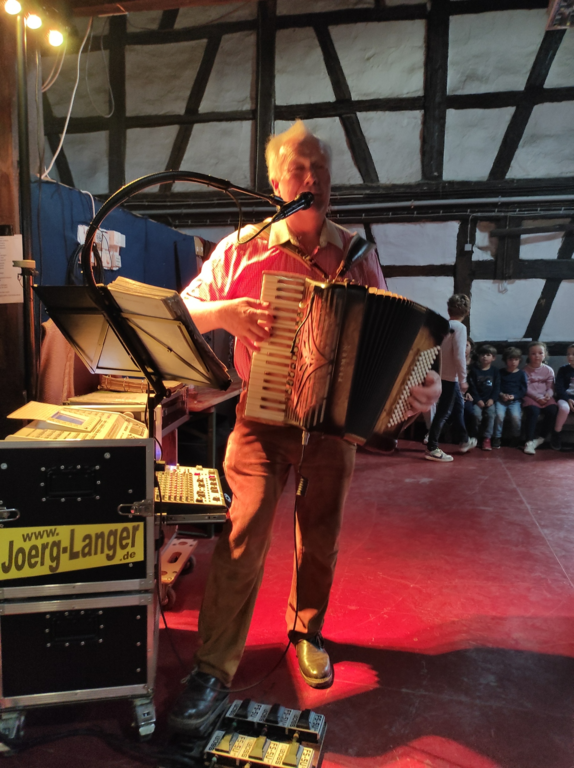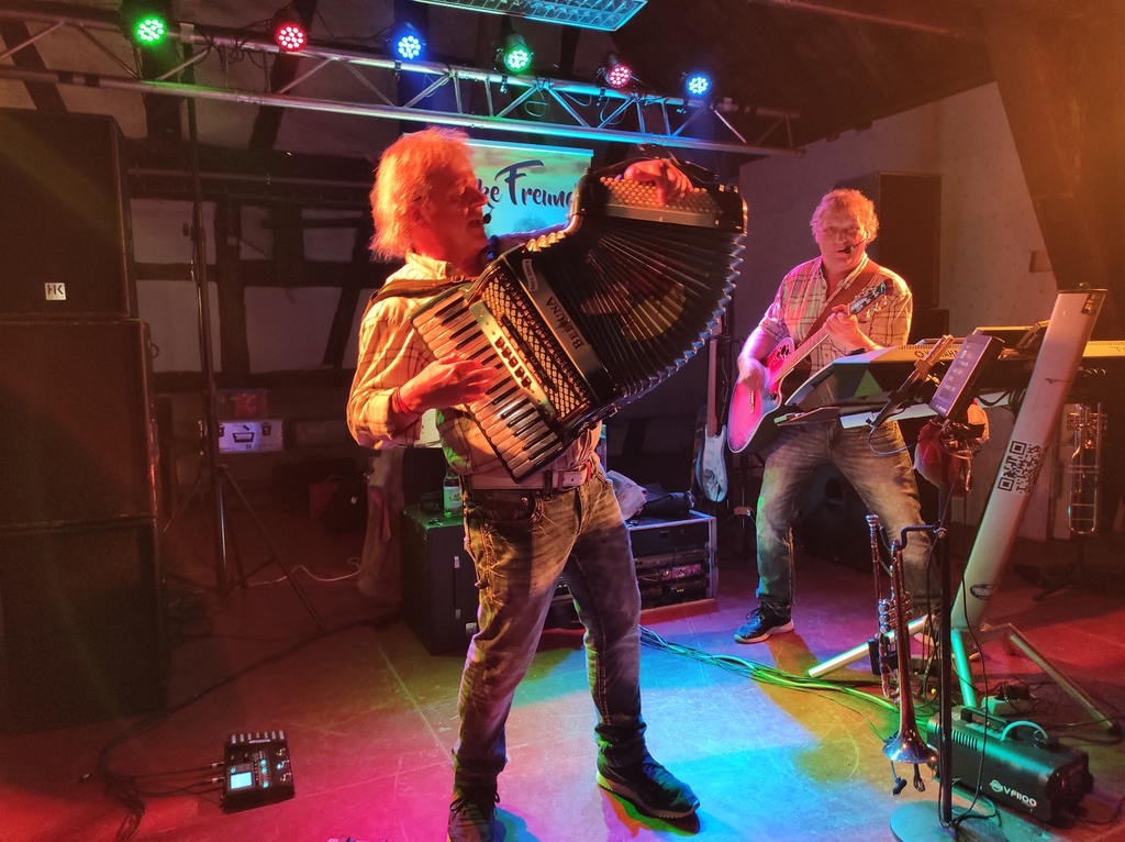 Am Samstag brachten die „Starken Freunde“ die Kelter zum kochen. Die beiden Vollblutmusiker aus Oberstaufen begeisterten das Publikum. Kaum einen Gast hielt es auf seinem Sitz und selbst eine Polonaise schlängelte sich durch die Kelter.