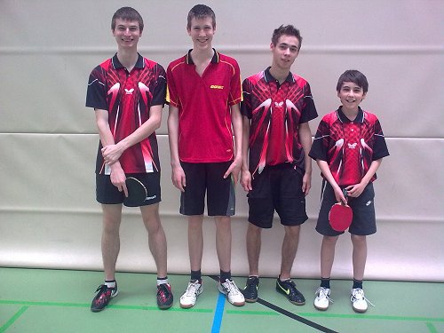 In einem spannenden Match sicherten sich die Jungen U18 I am Samstag mit einem 4:6 Erfolg in Steinheim die Meisterschaft in der Kreisliga. Damit ist auch der Aufstieg in der kommenden Saison in die Bezirksklasse verbunden. Höpfigheim trat mit den Spielern Matthias Schwamm, Micha Teller, Christian Kunkel und Valentin Sigmund an. Gleich zu Beginn setzten sich die beiden Doppel Matthias/Valentin und Micha/Christian überraschend klar gegen ihre Kontrahenten aus Steinheim durch. Damit war die Grundlage für den späteren Sieg gelegt. Steinheim konterte dann mit zwei Siegen im vorderen Paarkreuz, wobei sich Matthias Schwamm nur knapp nach fünf Sätzen geschlagen geben musste. Dann stellte Höpfigheim, durch zwei Siege von Christian Kunkel und Valentin Siegmund, den alten Vorsprung wieder her. Die beiden Siegpunkte erzielten dann noch Micha Teller und Valentin Sigmund zum 4:6 Endstand. Ausschlaggebend für den Sieg gegen Steinheim waren die Erfolge in den Doppeln und die bestechende Form unseres Jokers Valentin, der beide Einzelspiele klar in drei Sätzen gewann.